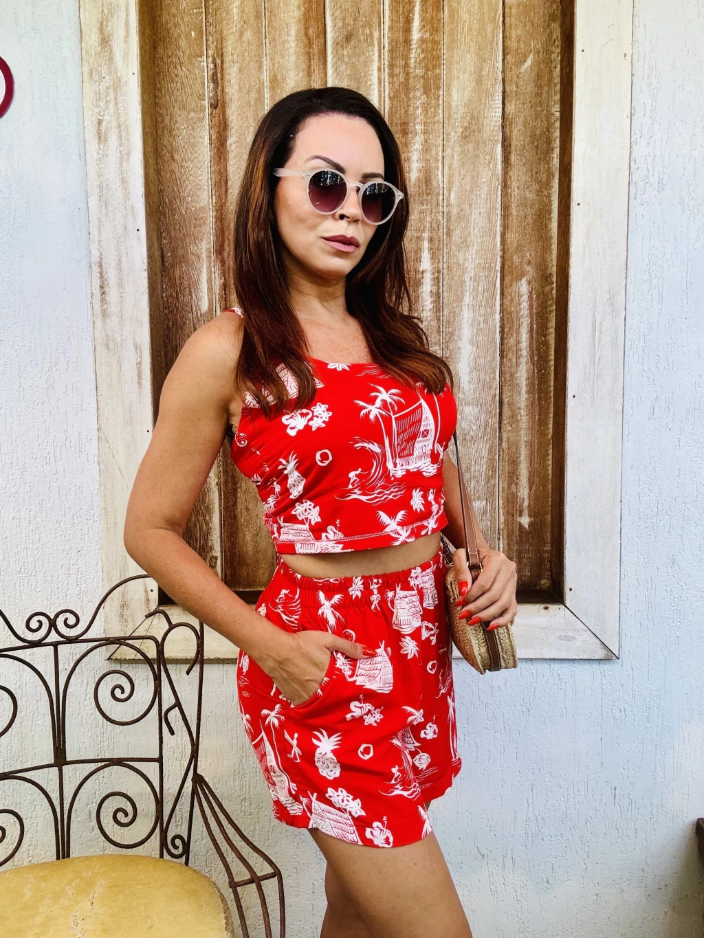 Conjunto de cropped e short estampado.